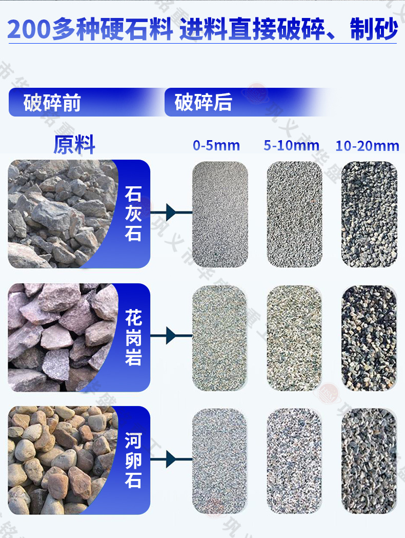 河卵石、方解石、石英、玻璃、大理石、鵝卵石、膨潤(rùn)土、鐵礦石、青石、山石、石灰石、風(fēng)化砂、輝綠巖、花崗巖、玄武巖等物料的破碎制砂工作。